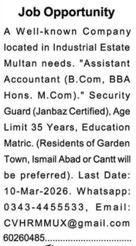 - Last Date to Apply: Assistant Accountant Career Opportunities 2026 in Industrial Estate Multan 10 March, 2026 (or as mentioned in the newspaper advertisement)