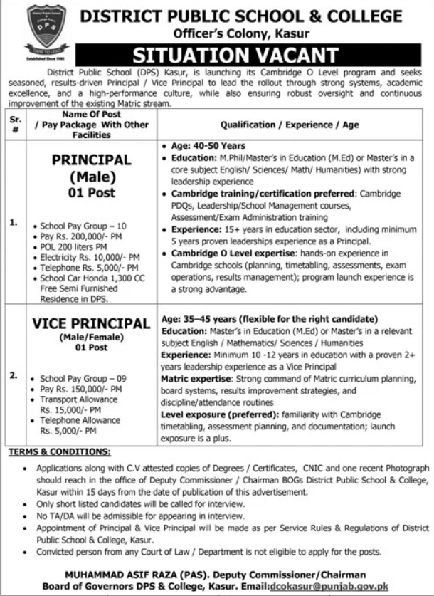 This advertisement from District Public School & College, Kasur, announces job openings for the positions of Principal and Vice Principal as the institution launches its Cambridge O Level program.