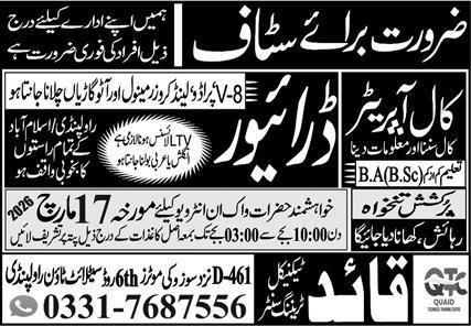 Advertisement Driver and Call Operator Jobs at Quaid Technical Training Institute
