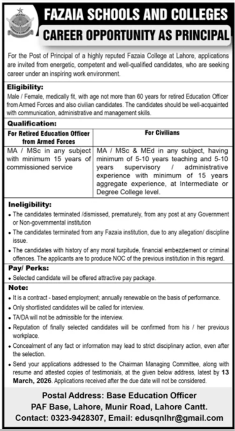 Fazaia Schools and Colleges Lahore, Punjab, Pakistan is inviting applications from qualified and experienced candidates for the position of Principal, as advertised in the daily Jang Newspaper dated March 8, 2026. Candidates possessing educational qualifications such as Bachelor, Master, MA, MSc, or MS will be given preference.