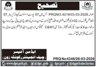 Last Date to Apply: Job At Communication & Works Department Quetta In 11 April, 2026 (or as per newspaper advertisement)