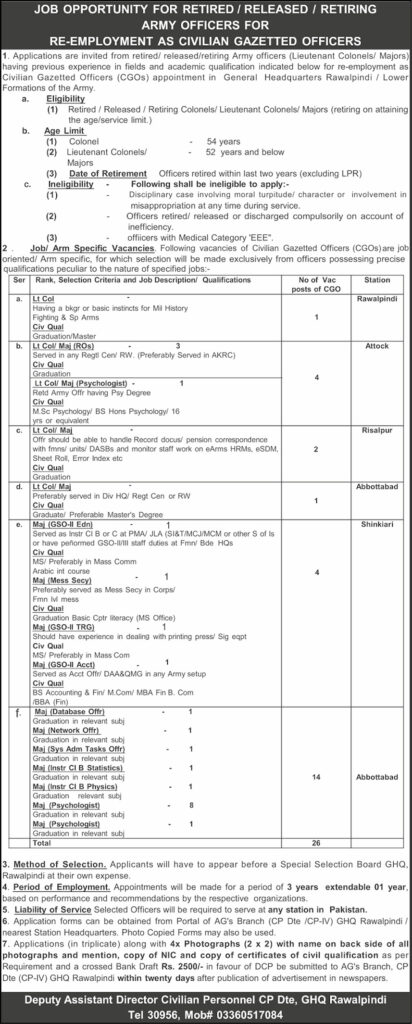 General Headquarters (GHQ) Rawalpindi has announced multiple vacancies including Civilian Gazetted Officer (CGO), retired army officer, and retired staff positions.