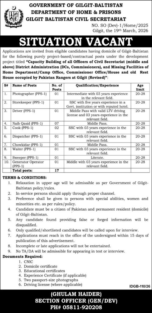 The Home & Prison Department has announced multiple job vacancies in its latest advertisement published in Daily Nation dated 27 March 2026. The available positions are in Gilgit, Gilgit Baltistan, Pakistan.