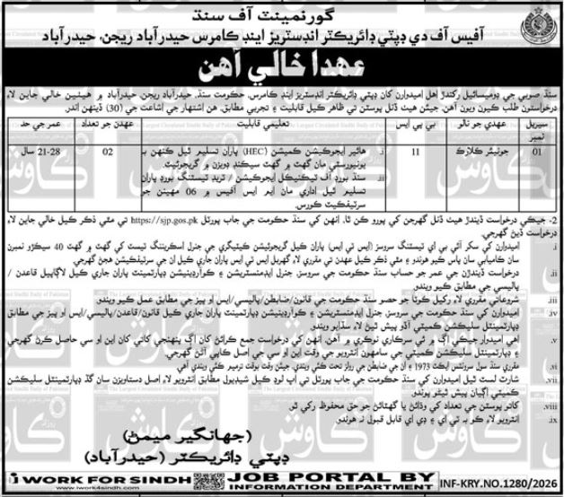 Industries & Commerce Department has announced vacancies as per the job advertisement published in Daily Kawish on April 2, 2026, for Hyderabad, Sindh, Pakistan. The available positions are Junior Clerk and Clerk.