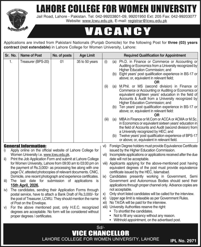 Lahore College for Women University invites applications from eligible candidates for various positions, including the post of Treasurer, as advertised on 26 March 2026 in a daily newspaper. The vacancies are based in Lahore, Punjab, Pakistan.