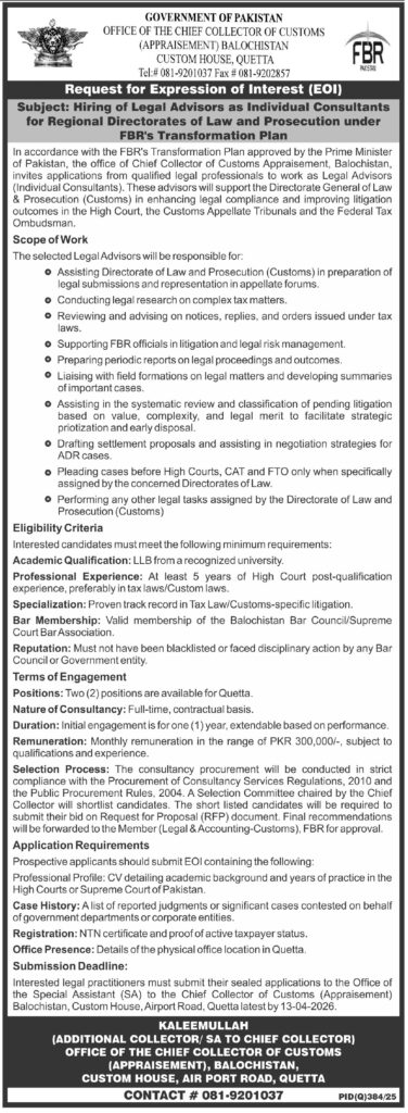 Custom House is seeking qualified candidates for the position of Legal Advisor, as advertised in the Daily Express Tribune on 28 March, 2026, for its office in Quetta, Balochistan.
