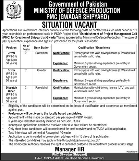 The available vacancies include Driver and Dispatch Rider in the Ministry of Defence Production Rawalpindi.
