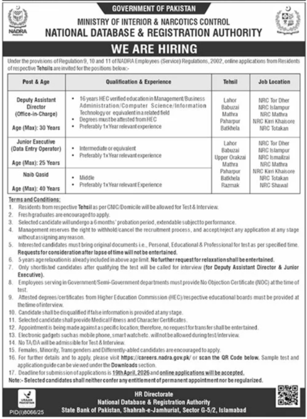 - Expected Last Date: Job At National Database & Registration Authority NADRA In 2026 19 April, 2026 (or as per newspaper ad)