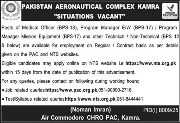 Pakistan Aeronautical Complex (PAC) has announced new job opportunities through an advertisement published on 6 April 2026 in the daily Ausaf Newspaper. Applications are invited for multiple positions including Program Manager, Medical Officer, and Program Manager Mission Equipment in Attock, Punjab.