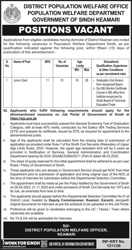 Population Welfare Department, Kemari Town Karachi, Sindh, Pakistan invites applications from suitable candidates for the posts of Clerk and Junior Clerk, as per advertisement published on 25 March, 2026 in the daily Business Recorder newspaper. Candidates with Bachelor’s degree and DAE qualification will be preferred.