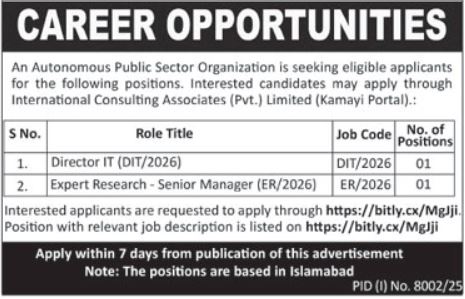 A Public Sector Organization has announced new job opportunities in Islamabad through a job advertisement published in the daily Ausaf newspaper dated 6 April 2026. The organization is inviting applications for multiple positions including Manager, Director IT, and Research Expert.