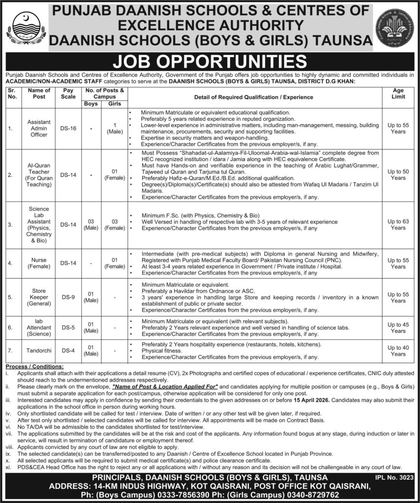 Punjab Daanish Schools & Center Of Excellence Authority has announced multiple vacancies as per advertisement published on March 27, 2026, in a daily newspaper for Dera Ghazi Khan, Punjab.