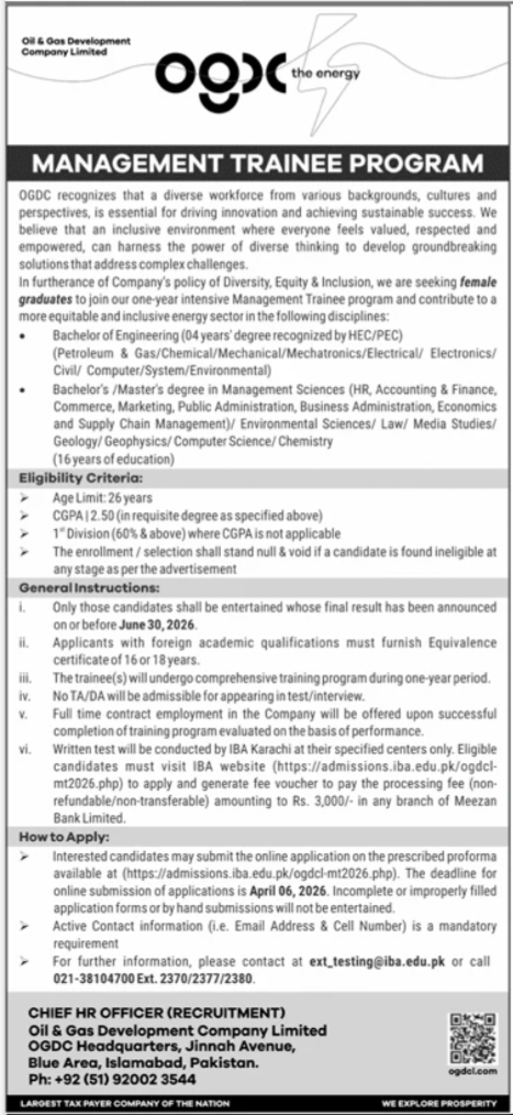 Interested applicants can apply for these latest Government Management jobs at Oil & Gas Development Company Limited until 06 April, 2026, or according to the closing date mentioned in the newspaper advertisement.