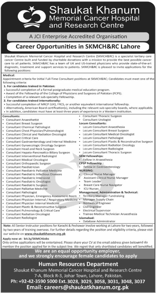 It is advised to read the complete advertisement online to check eligibility criteria, experience requirements, and the application procedure for the latest job opportunities at Shaukat Khanum Memorial Cancer Hospital & Research Centre.