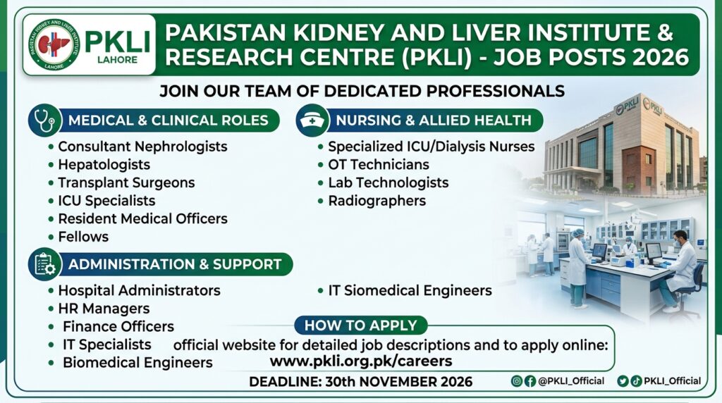 Pakistan Kidney and Liver Institute and Research Centre has announced multiple job vacancies as per advertisement published on 28 February, 2026 in the Daily Other Newspaper. Applications are invited from qualified and experienced candidates for the following positions in Lahore, Punjab: