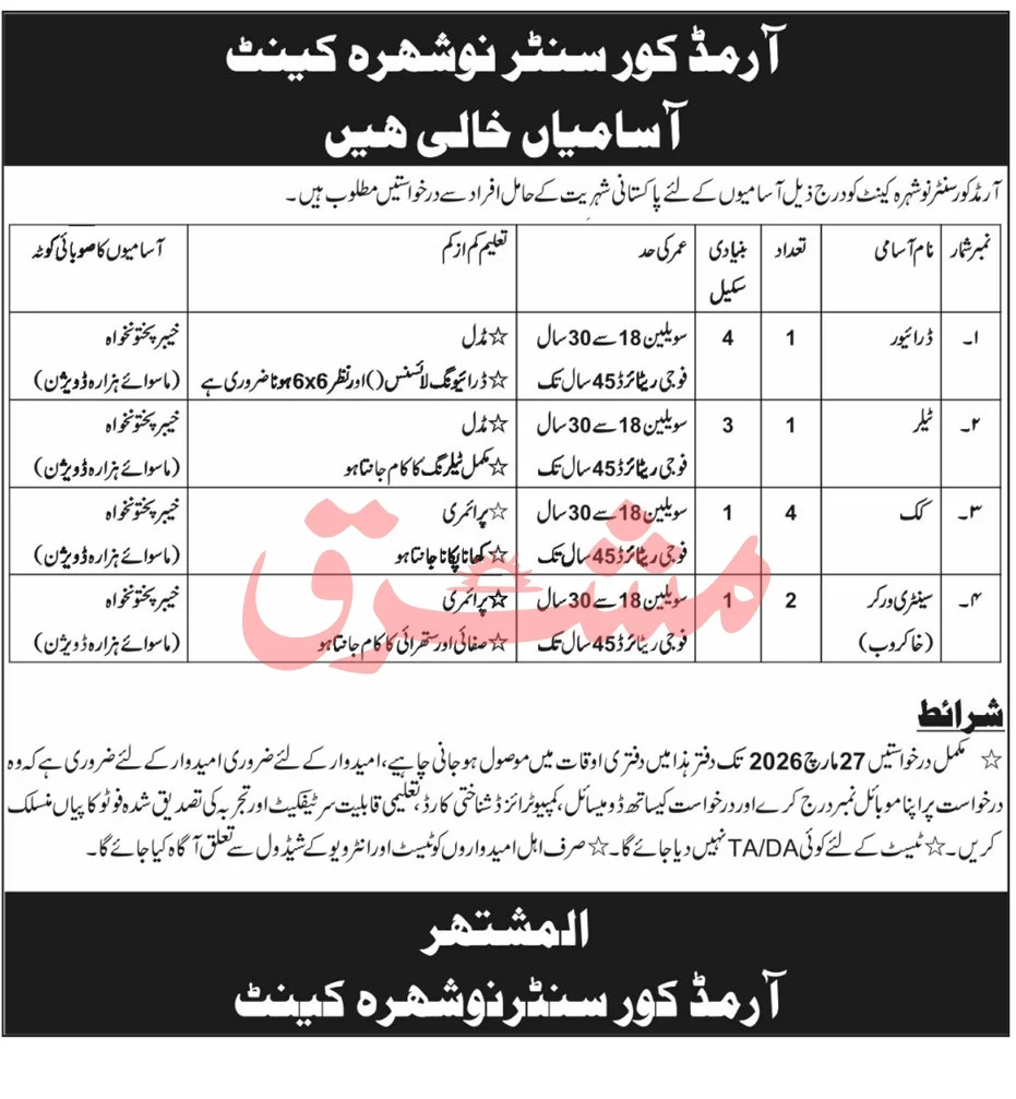 - Applications must reach the Armoured Corps Centre Nowshera Cantt office before 27 March 2026 during office hours.