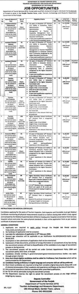 The Department of Tourist Services (DTS) is inviting applications for the post of Assistant Director (Operations) under the Punjab Tourism Force initiative. These vacancies are open in different districts across Punjab.
