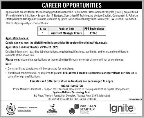- Last Date to Apply: Jobs At Assistant Manager Grants 2026 In Ignite Pakistan 29 March, 2026 (or as per newspaper advertisement)
