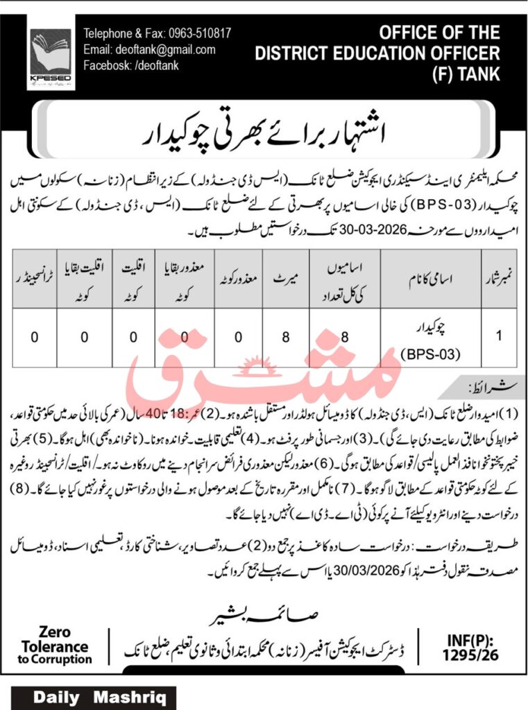 The Elementary and Secondary Education Department (ESED) has announced job openings in an advertisement published in the Mashriq Newspaper on 28 March 2026. Applications are invited for the position of Chowkidar in Peshawar, Khyber Pakhtunkhwa, Pakistan.