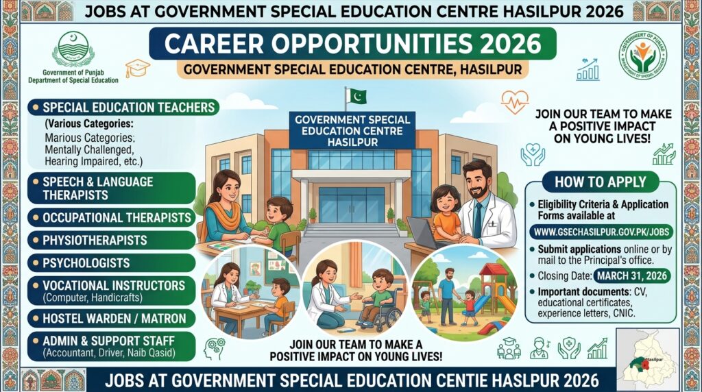 The Government Special Education Centre Hasilpur has announced new contract-based job opportunities for 2026 under the Special Education Department Punjab. Applications are invited from both fresh and experienced candidates for various positions (details available in the advertisement).