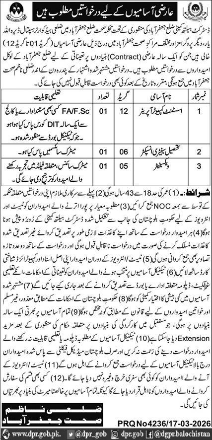 - Last Date to Apply: Jobs At Health Department Jaffarabad Tehsil Sanitary Inspector In 02 April, 2026 (or as per newspaper advertisement)
