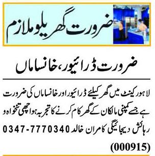 Advertisement Jobs At Khansama & Driver In Lahore 2026
