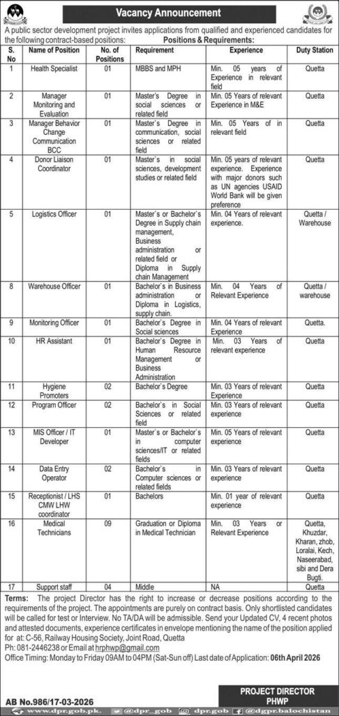A Public Sector Organization has announced multiple job vacancies as per the advertisement published in the Daily Express Newspaper on 18 March 2026 for Quetta, Balochistan.
