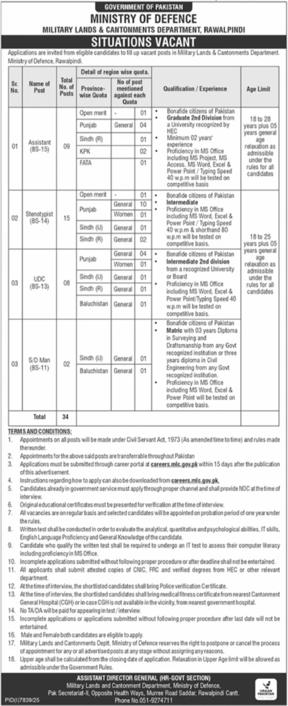 The Military Lands and Cantonment Department in Rawalpindi, Punjab, Pakistan has announced job opportunities through the Jang Newspaper dated March 28, 2026. Applications are invited from eligible candidates for the positions of SD Man, UDC, Stenotypist, and Assistant.