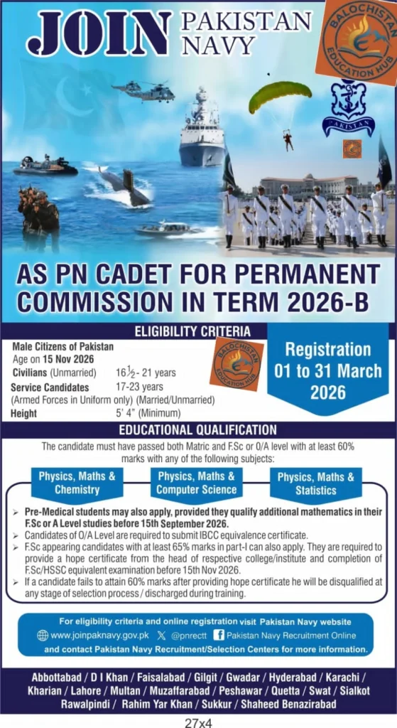 Pakistan Navy has announced Permanent Commission opportunities for the post of PN Cadet for eligible male candidates across Pakistan. This is a golden chance for fresh and experienced individuals who wish to build a long-term career in the armed forces.