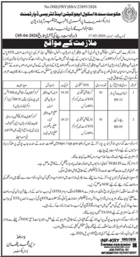 The School Education & Literacy Department invites applications from qualified candidates for multiple positions as advertised in the Daily Jang Newspaper on March 20, 2026, for Nawabshah, Sindh.