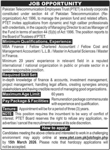 Pakistan Telecommunication Employees Trust (PTET) Islamabad has announced new career opportunities as per the advertisement published on March 1, 2026, in the Jang Newspaper. Applications are invited from qualified and experienced candidates for the position of Manager.