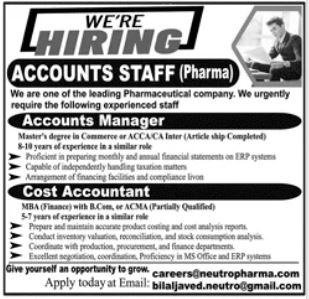 Neutro Pharma Pvt Limited has announced new job opportunities in Lahore as advertised in the Daily Jang Newspaper on 8 March 2026. The company is inviting applications from qualified and experienced candidates for the positions of Accounts Manager and Cost Accountant in Lahore, Punjab, Pakistan.