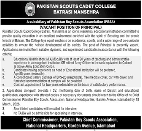 Advertisement at Vacancy for Principal at Pakistan Scouts Cadet College Mansehra