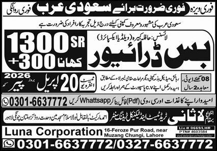 Luna Corporation in Riyadh, Saudi Arabia is inviting applications from suitable candidates for the position of Bus Driver, as advertised in the Daily Express Newspaper on April 19, 2026. Applicants with a Middle-level education or equivalent will be given preference.