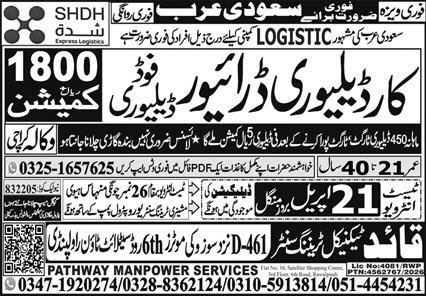 Pathway Manpower Services is seeking applications from suitable candidates for the position of Car Delivery Driver in Riyadh, Saudi Arabia. This opportunity was advertised in the Express Newspaper on April 19, 2026.