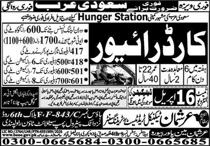 Latest driving vacancies are announced by Arshman Manpower Bureau in Dammam, Saudi Arabia, as per the advertisement published in the Daily Express dated 14 April 2026. Available positions include car driver, LTV driver, and general driver.