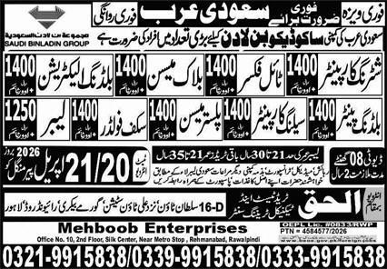 Al Haq Trade Test & Technical Training Center, Riyadh and Makkah (Saudi Arabia), is inviting applications from suitable candidates for multiple construction positions as advertised in the Express Newspaper dated 15 April, 2026.