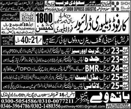 Pathway Manpower Services is offering multiple driving job opportunities in Dammam and Tabuk, Saudi Arabia, as advertised in the Daily Express Newspaper on 23 April 2026. Available positions include car food delivery driver, delivery driver, driver, food delivery driver, and car driver. Candidates with Matric or Intermediate qualifications will be preferred.