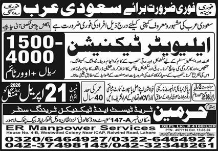 Harmain Trade Test & Technical Training Center, Dammam / Al Khobar, Saudi Arabia, is inviting applications from suitable candidates for the position of Elevator Technician, as advertised on 18 April 2026 in the Express Newspaper.