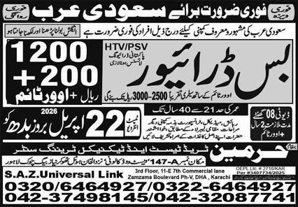 Harmain Trade Test & Technical Training Center has announced multiple driving vacancies published in the Express Newspaper on 21 April, 2026. The positions are based in Riyadh and Taif, Saudi Arabia.