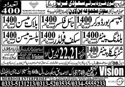 Vision Technical Training Center has announced multiple overseas construction vacancies in Dammam and Riyadh, Saudi Arabia, as per the 21 April 2026 advertisement published in the Daily Express Newspaper.