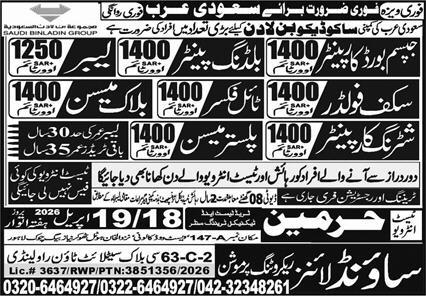 Harmain Trade Test & Technical Training Center is offering multiple overseas construction job opportunities in Dammam and Tabuk, Saudi Arabia, as advertised in the Daily Express Newspaper on 16 April 2026.