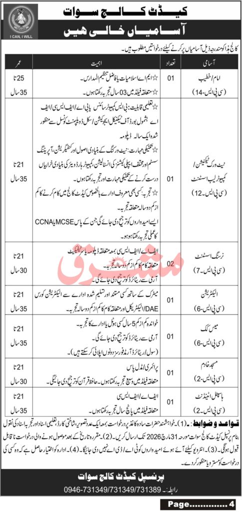 Cadet College Swat is inviting applications from qualified and eligible candidates for multiple positions as advertised in the Daily Mashriq on March 24, 2026.